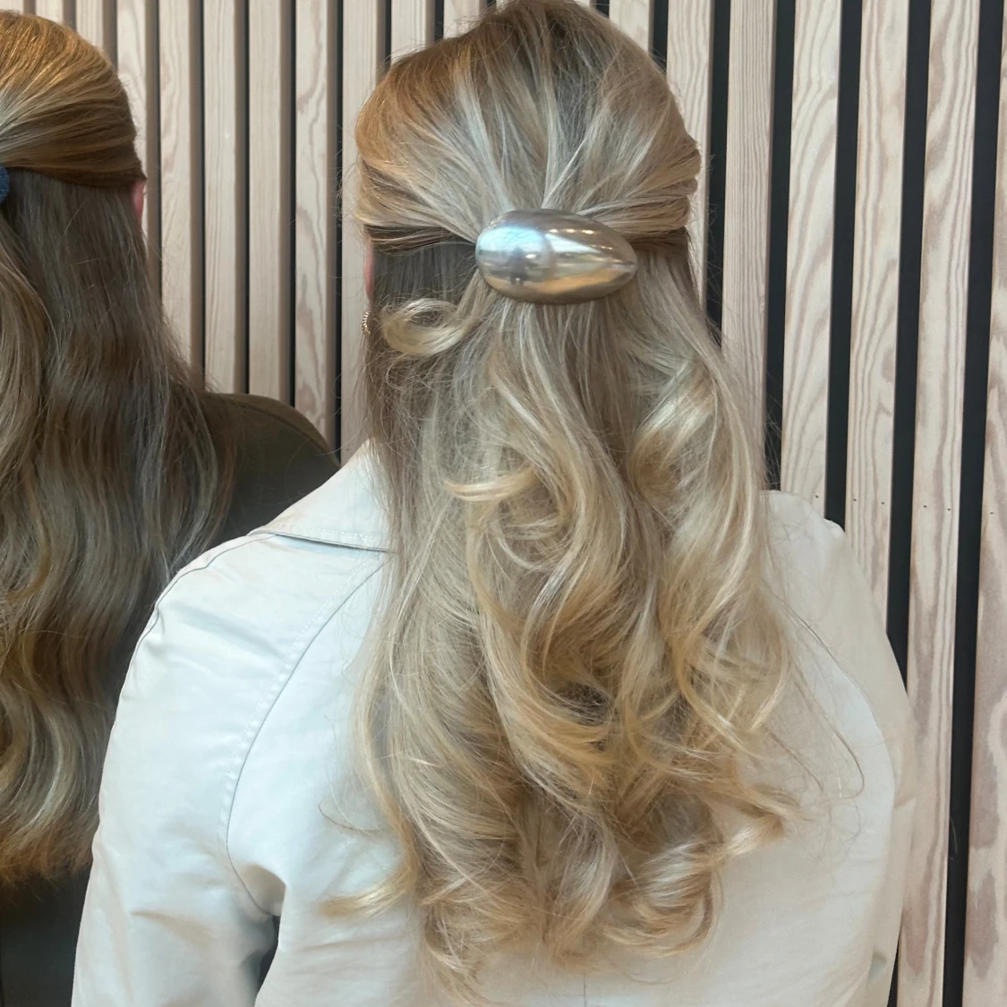 Snyggt och stilren hårklämma i silver. Perfekt för att ge frisyren en modern touch. Oval form som sitter stadigt. Gjort av återvunnet tyg och skedar!