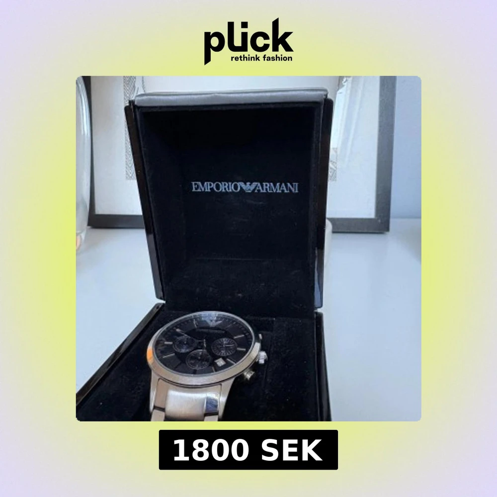 Stilren klocka från Emporio Armani med silverfärgat armband i metall och svart urtavla. Klockan har tre mindre urtavlor, datumvisning och tydliga indexmarkeringar. Snygg och modern design som passar till många olika outfits.