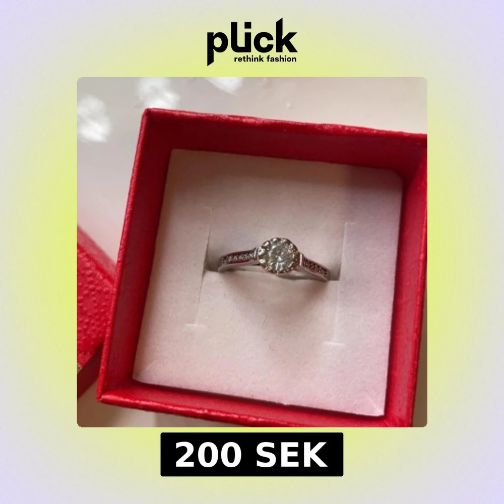 Säljer en snygg rostfritt silverfärgad ring med en stor rund glittrande sten i mitten och små stenar längs sidorna på ringen. Kommer i en röd ask. Inget fel på ringen.