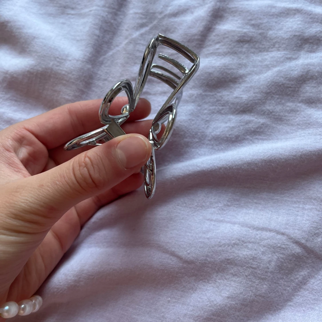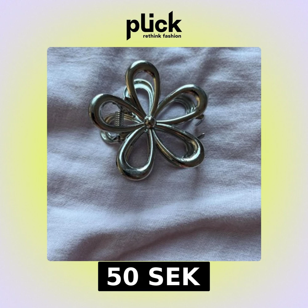 Säljer en snygg hårklämma i silverfärgad metall med en cool blomformad design. Klämman har fem stora kronblad och en blank finish som ger en trendig vibe. Perfekt för att piffa upp frisyren med en statement-accessoar.