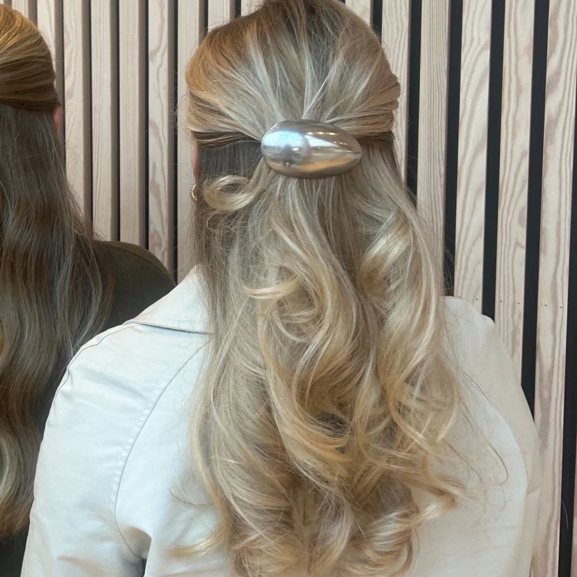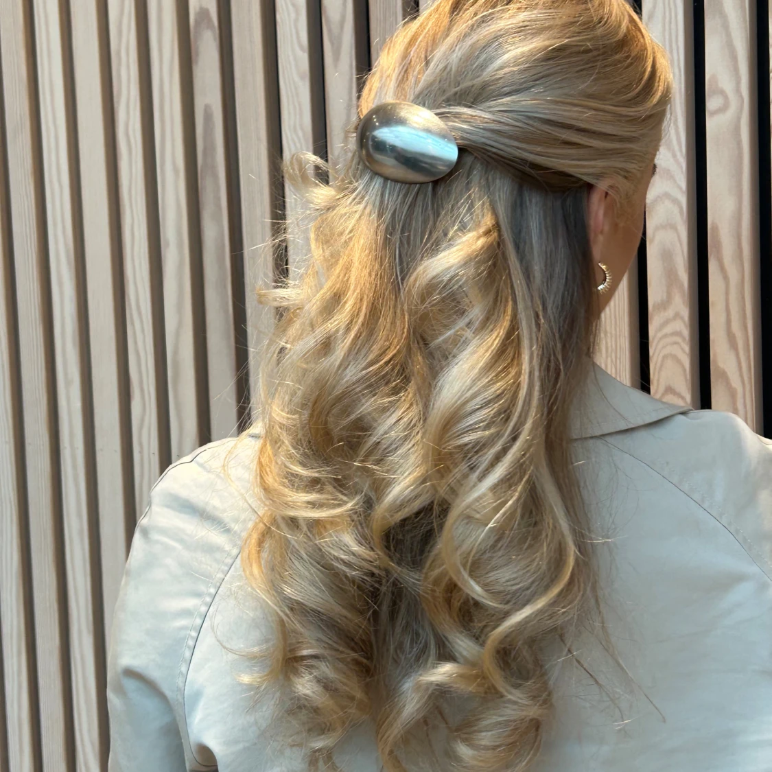 Säljer en oval hårklämma i blank silverfärg som ger en cool och modern vibe till din frisyr. Perfekt för att hålla halva håret uppe och skapa en snygg look. Klämman är gjord av återvunna skedar och återvunnet tyg.
