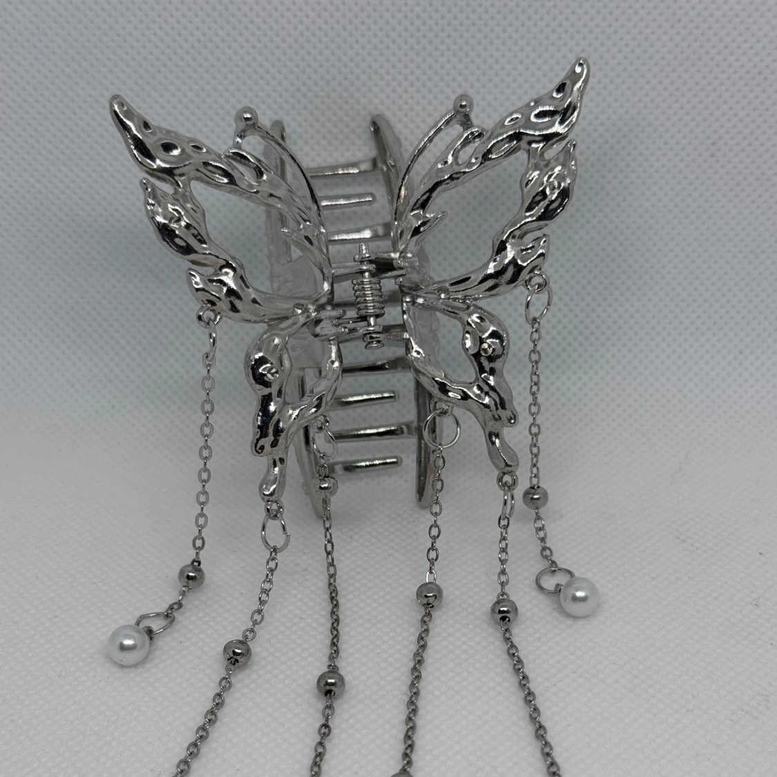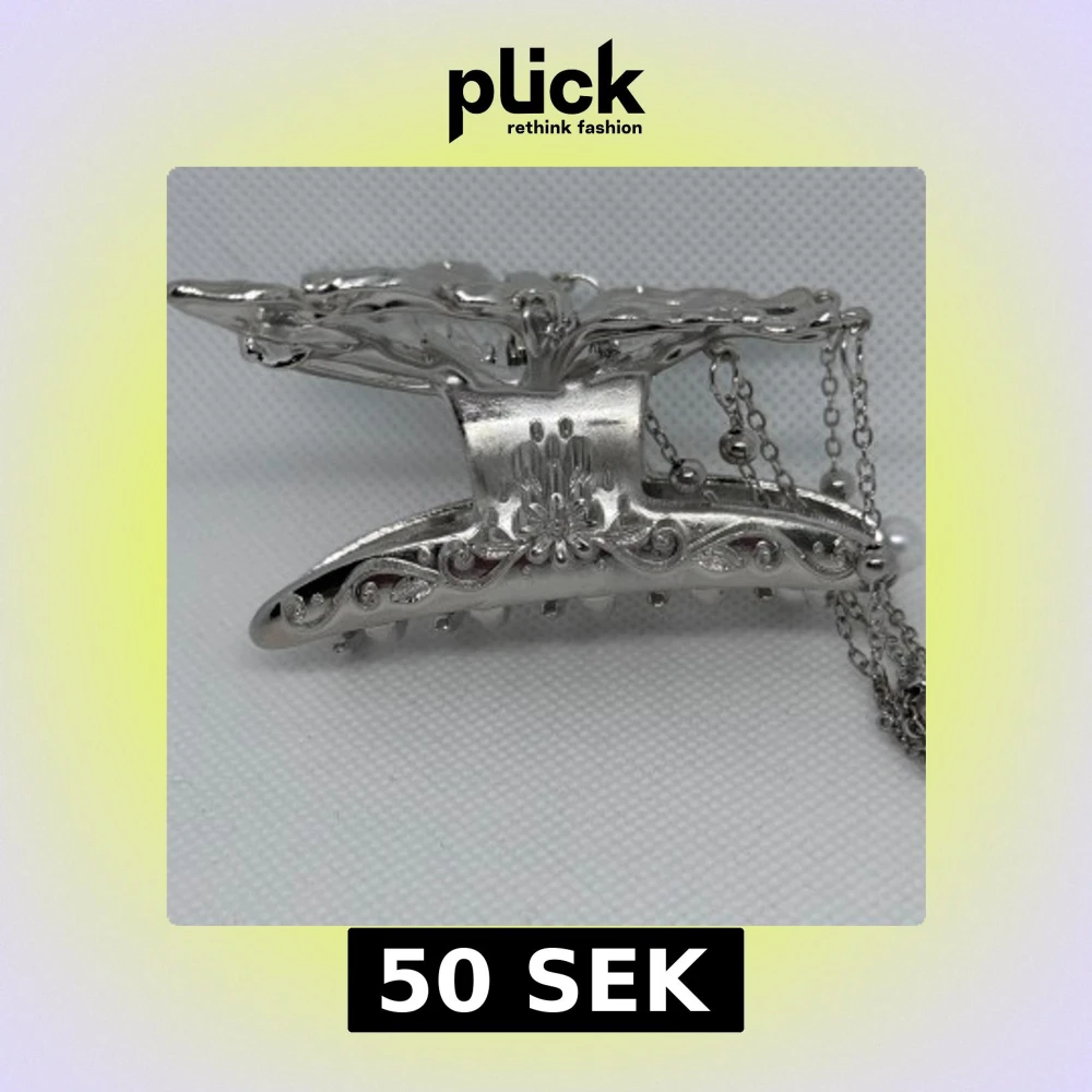 Säljer en snygg silverfärgad hårklämma i form av en fjäril. Klämman har dekorativa kedjor med pärlor som hänger ner och ger en unik look. Perfekt accessoar för att lyfta din frisyr.