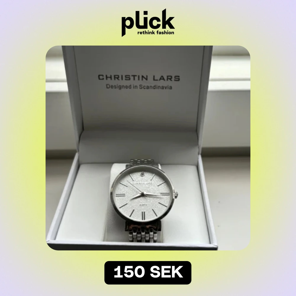 Säljer en stilren och elegant silverfärgad klocka från Christin Lars. Klockan har en klassisk design med en vit urtavla och silverfärgade detaljer. Armbandet är gjort av metall och har en bekväm passform. Perfekt för både vardag och fest💕
