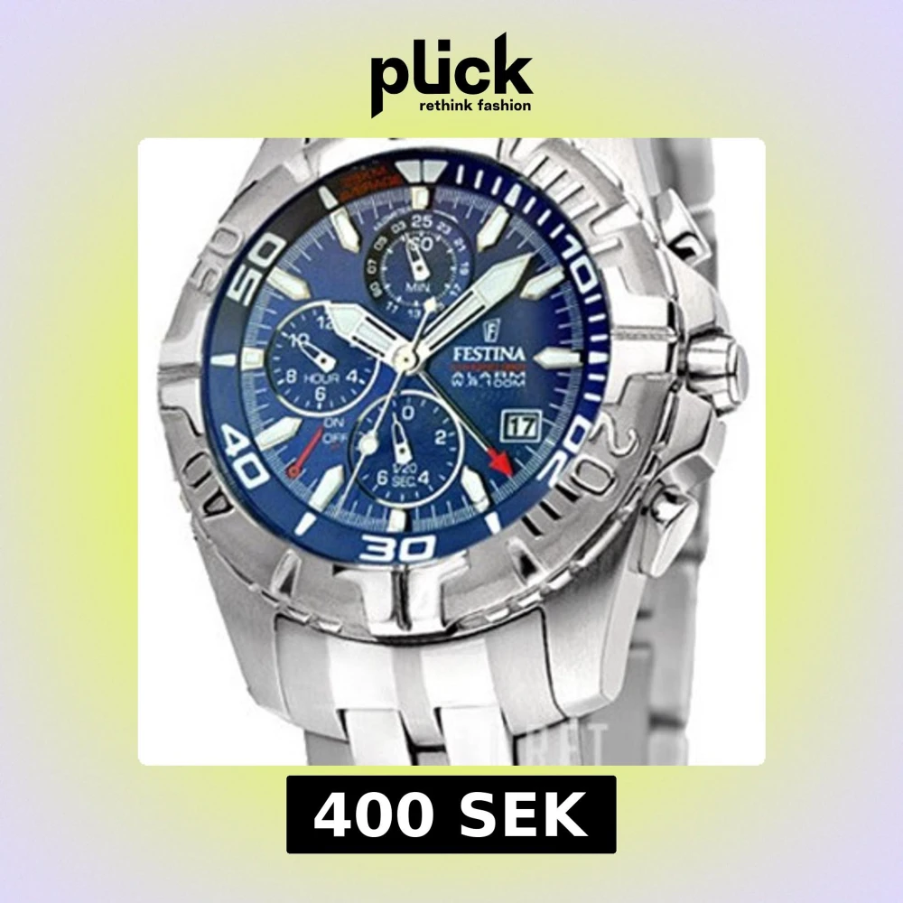 Snygg och robust silverfärgad klocka från Festina med blå urtavla och flera små urtavlor för extra funktioner. Klockan har en datumvisare och tydliga siffror på bezeln. Perfekt för den som gillar en sportig och stilren look.