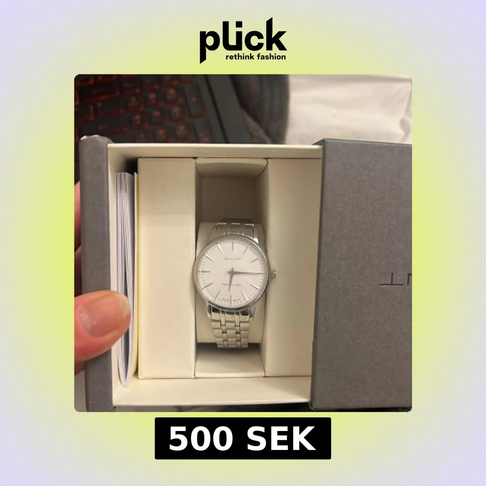 Äkta stilren klocka från GANT med rund vit urtavla och silverfärgat armband i metall. Klockan har minimalistisk design med tydliga markeringar och GANT-logga på både urtavla och spänne. Levereras i originalask.