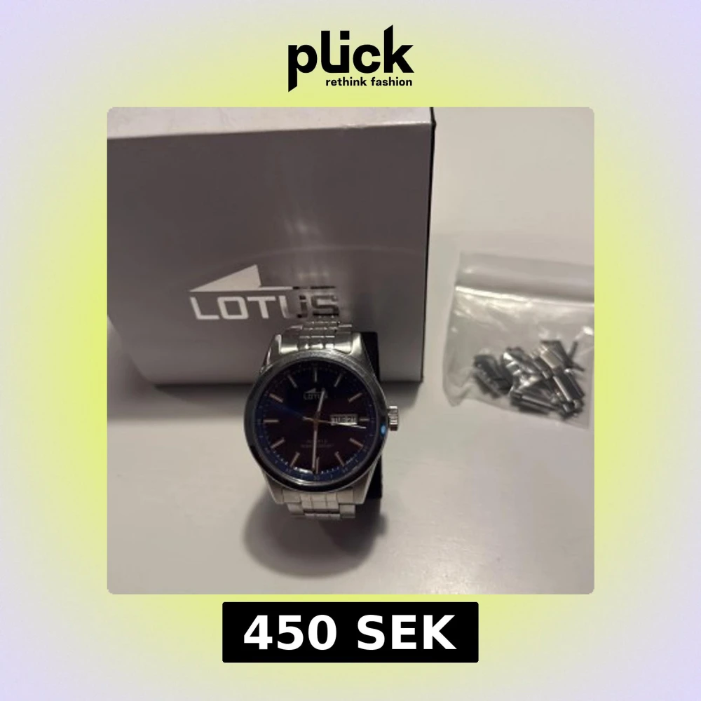 Snygg silverfärgad klocka från Lotus med blå urtavla och datumvisning. Armbandet är i metall och det medföljer extra länkar för justering. Perfekt för den som vill ha en stilren och funktionell klocka.