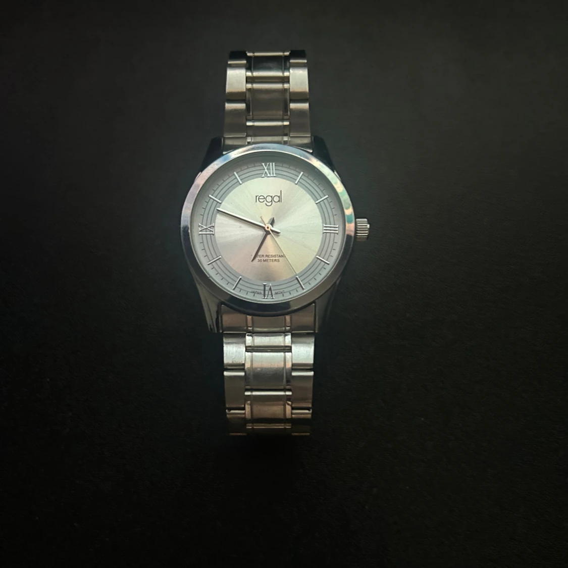 Stilren klocka från Regal med rund urtavla i silver och romerska siffror. Klockan har en klassisk länk i metall och en enkel, elegant design som passar till många olika stilar. Vattentålig upp till 30 meter.