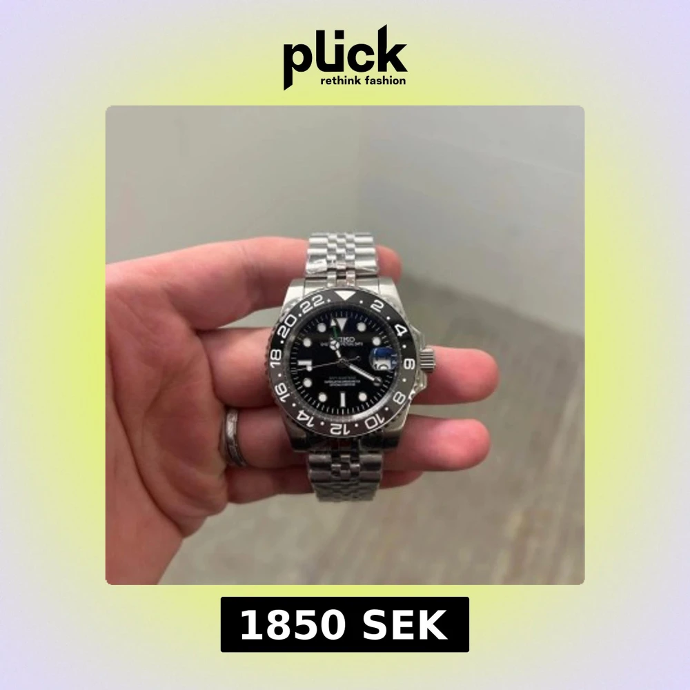 Säljer en stilren silverfärgad klocka från Seiko med svart urtavla och datumvisning. Klockan har en robust länkarmband i metall och en tydlig 24-timmarsmarkering på ringen. Perfekt för den som gillar en klassisk och tidlös design.