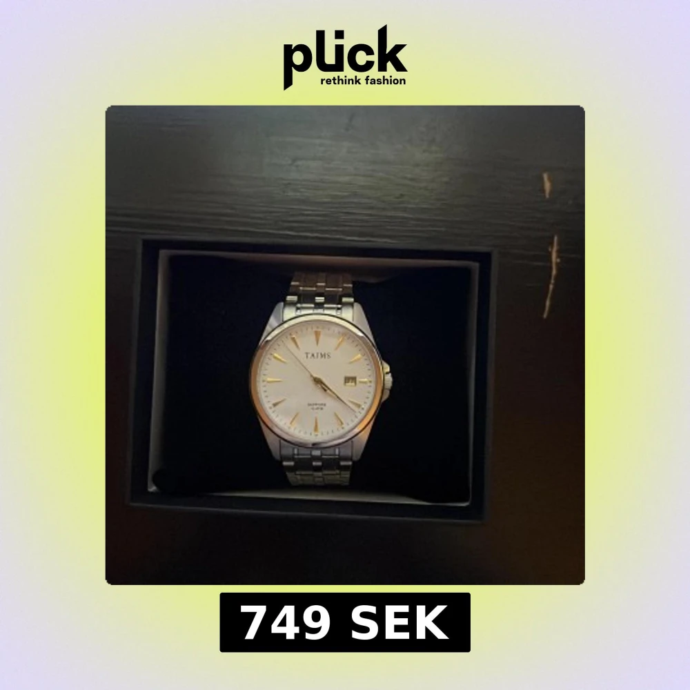 Stilren klocka från TAJMS med rund vit urtavla och silverfärgat armband i metall. Urtavlan har guldiga detaljer och datumvisning. Säljes i originalask och extra länkar medföljer. Perfekt accessoar för dig som gillar klassisk design.
