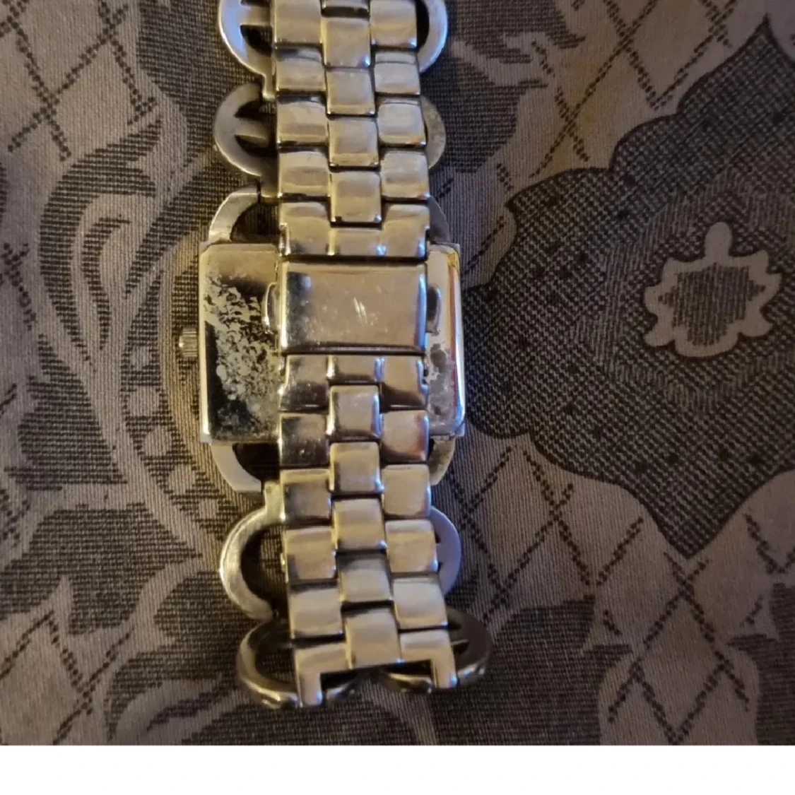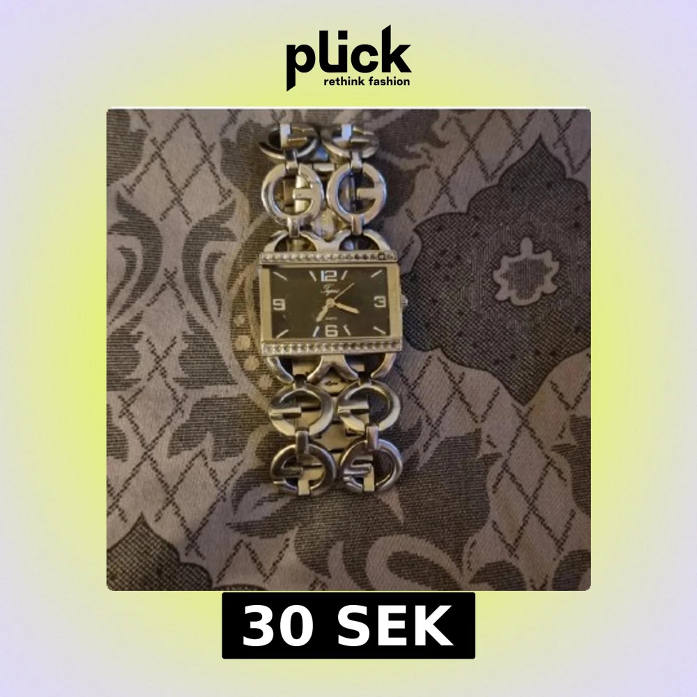 Stilren klocka liknande G*cci med rektangulär svart urtavla och silverfärgat armband. Armbandet har stora länkar med GG-detaljer och diskreta stenar runt urtavlan. Använt skick, behöver nytt batteri.