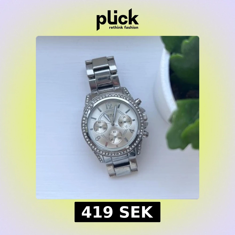Snygg silverfärgad klocka från O.N.E med strass runt urtavlan. Klockan har en metallarmband och flera små urtavlor för extra funktionalitet. Perfekt accessoar för att ge lite extra bling till din stil. Önskar du veta exakta mått? Tveka inte att höra av dig!