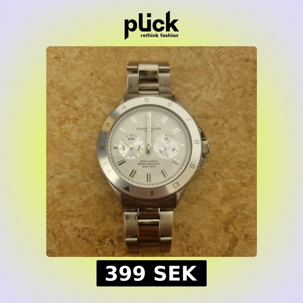 Stilren klocka från Philippe Palmer i silverfärgat rostfritt stål. Urtavlan är också silver med två mindre visartavlor för dag och datum. Klassisk länkarmband och tydliga indexmarkeringar. Vattentät upp till 30 meter och har quartz-urverk.