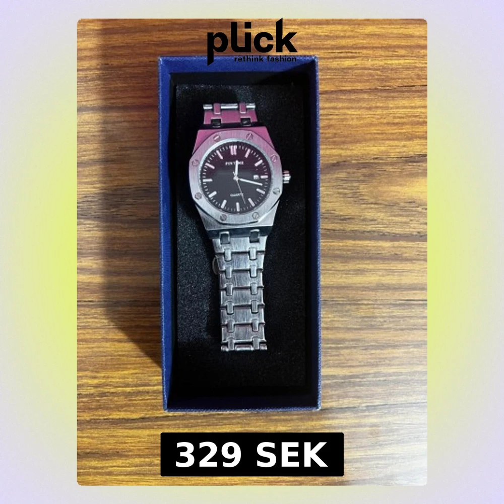 Stilren klocka med silverfärgat armband i metall och svart urtavla. Klockan har en kvadratisk boett med skruvdetaljer. Klockan kommer såklart med extra länkar så att den kan förstoras och förminskas. Den funkar utmärkt batteriet har en väldigt lång livstid kvar. Priset kan diskuteras.