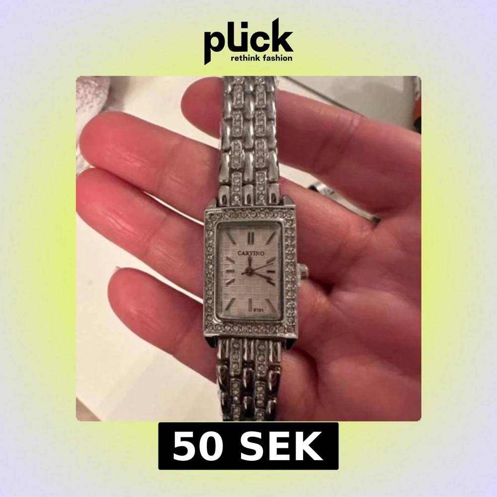 Snygg rektangulär klocka i silverfärg med glittrande stenar runt urtavlan och på länken. Urtavlan har ett diskret rutmönster och minimalistiska markeringar. Perfekt accessoar för att lyfta din stil.