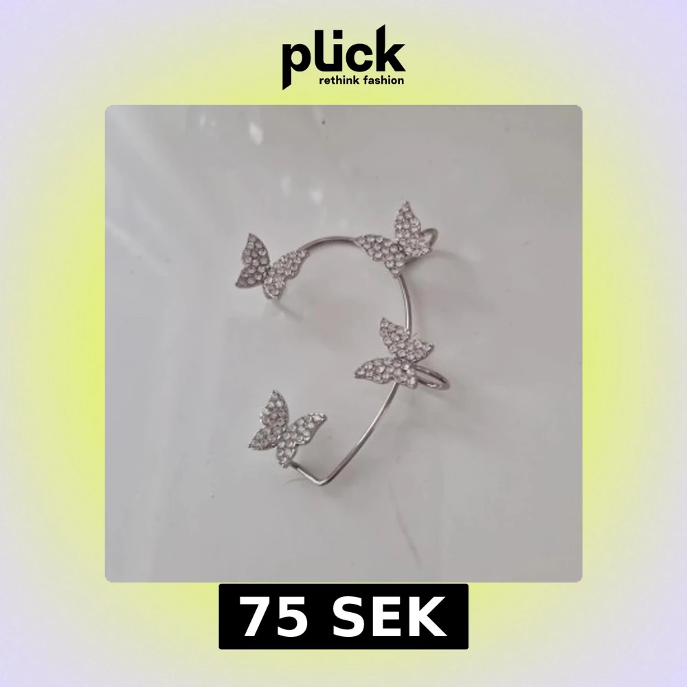 Elegant silverfärgad accessoar dekorerat med glittrande fjärilar. Perfekt för att lägga till en touch av glamour till din outfit. Den har en öppen design som gör det enkelt att justera efter örat