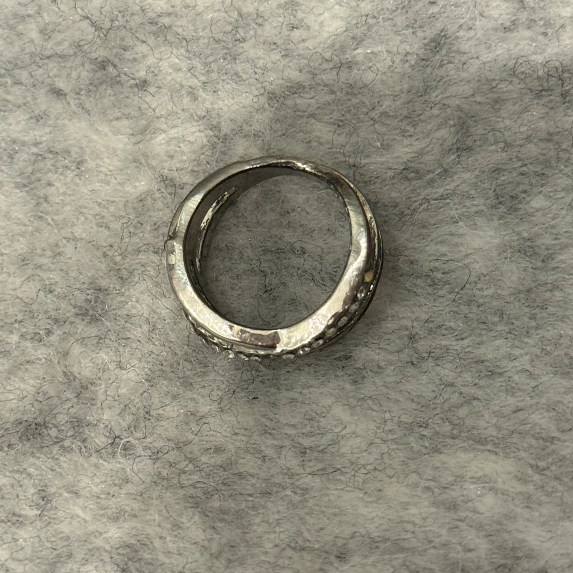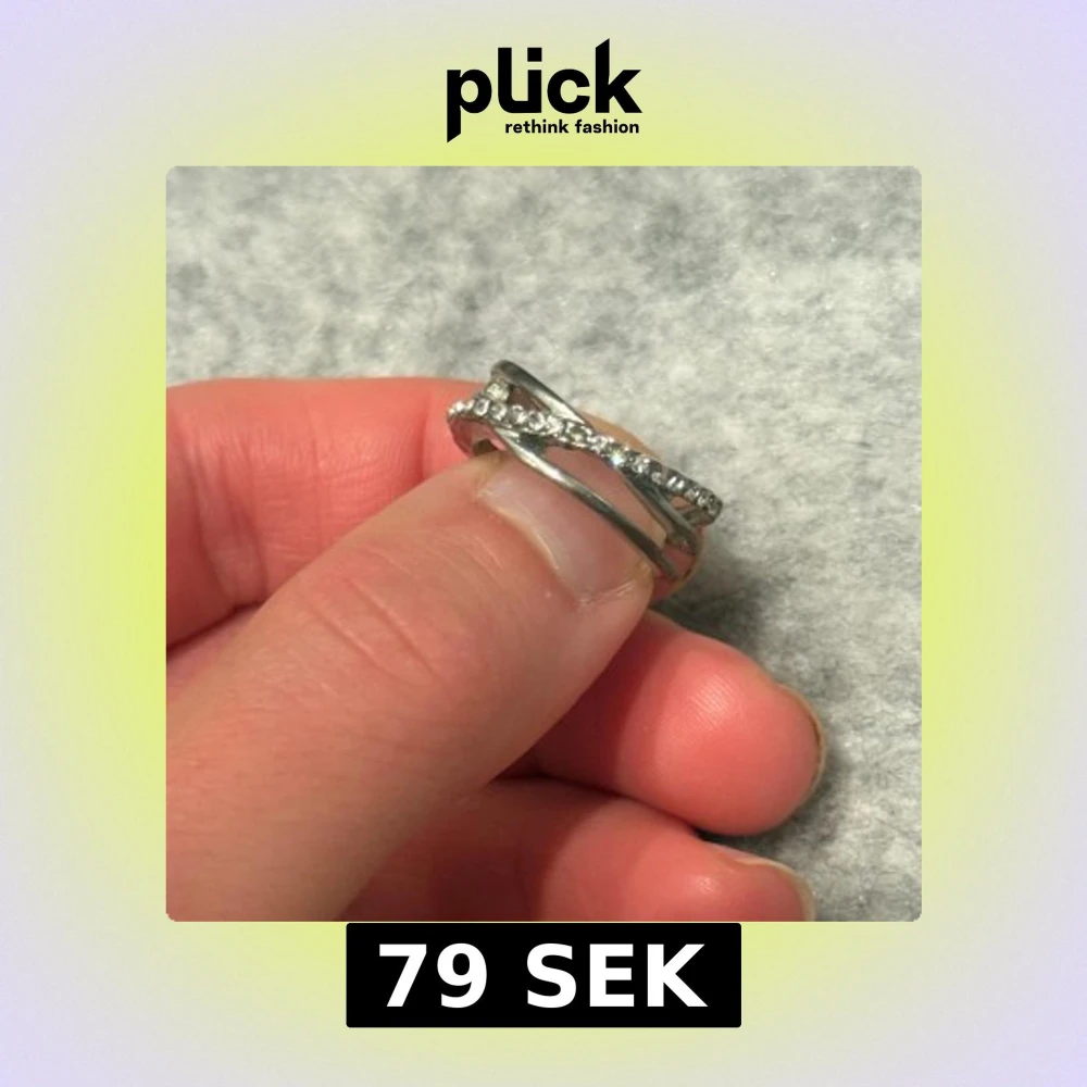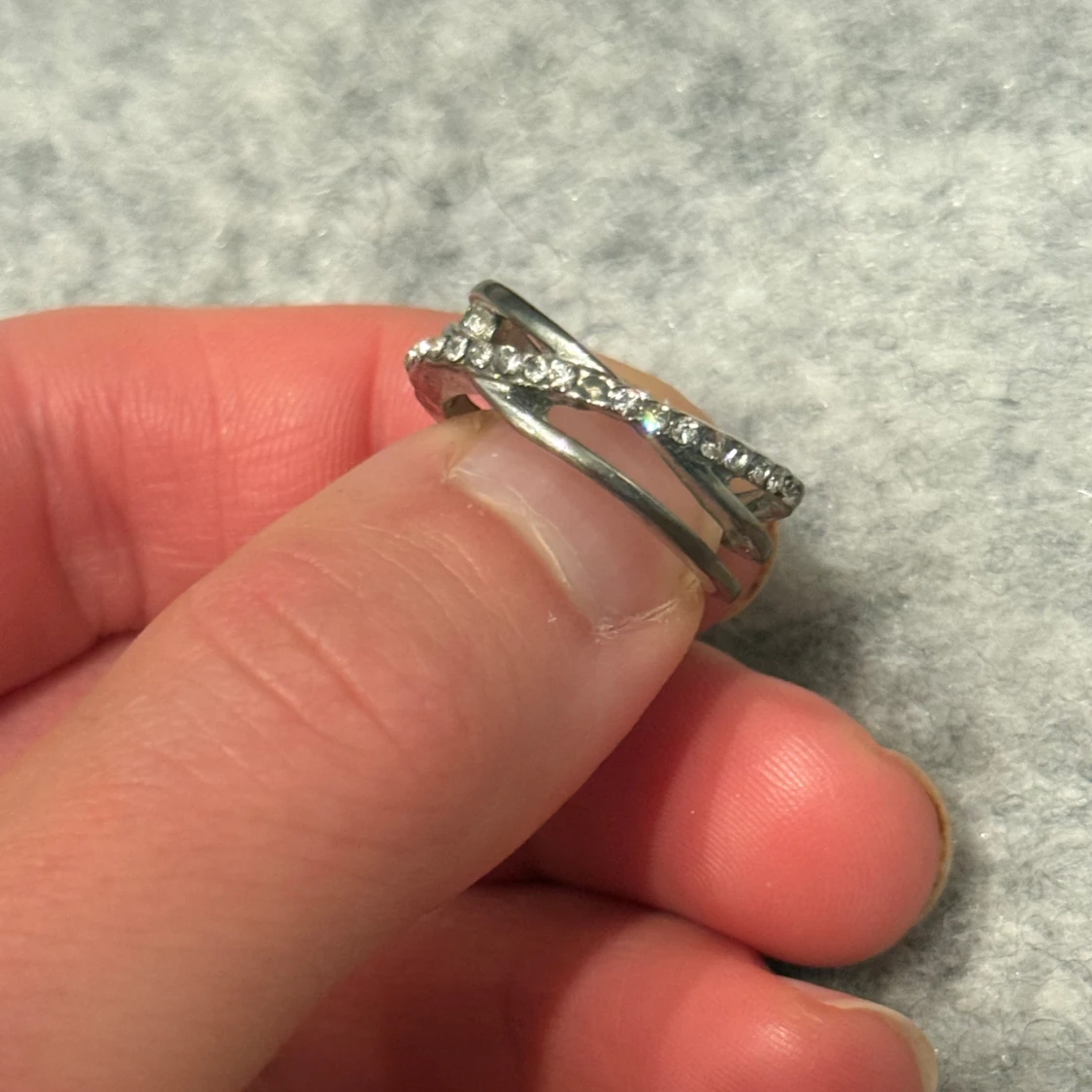 Snygg ring i silverfärg med ett coolt korsat band och glittrande stenar längs ena sidan. Ringen har en modern och unik design som sticker ut och passar perfekt för dig som gillar att glänsa lite extra.