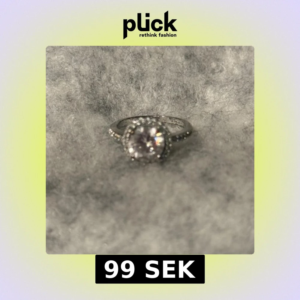 Stilren silverfärgad ring med en stor rund glittrig sten i mitten, omgiven av små gnistrande stenar runt om. Ringen har en klassisk och elegant design som verkligen fångar ljuset. Perfekt för dig som vill ha något som sticker ut och känns lyxigt.