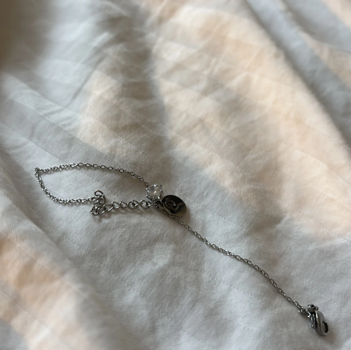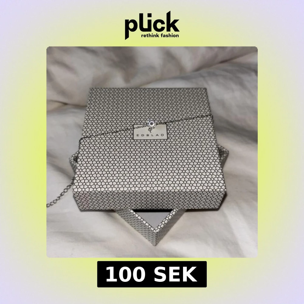 Säljer ett stilrent silverfärgat armband från Edblad med tunn kedja och en liten rund bricka med logotyp samt en gnistrande sten. Perfekt för dig som gillar minimalistiska smycken.