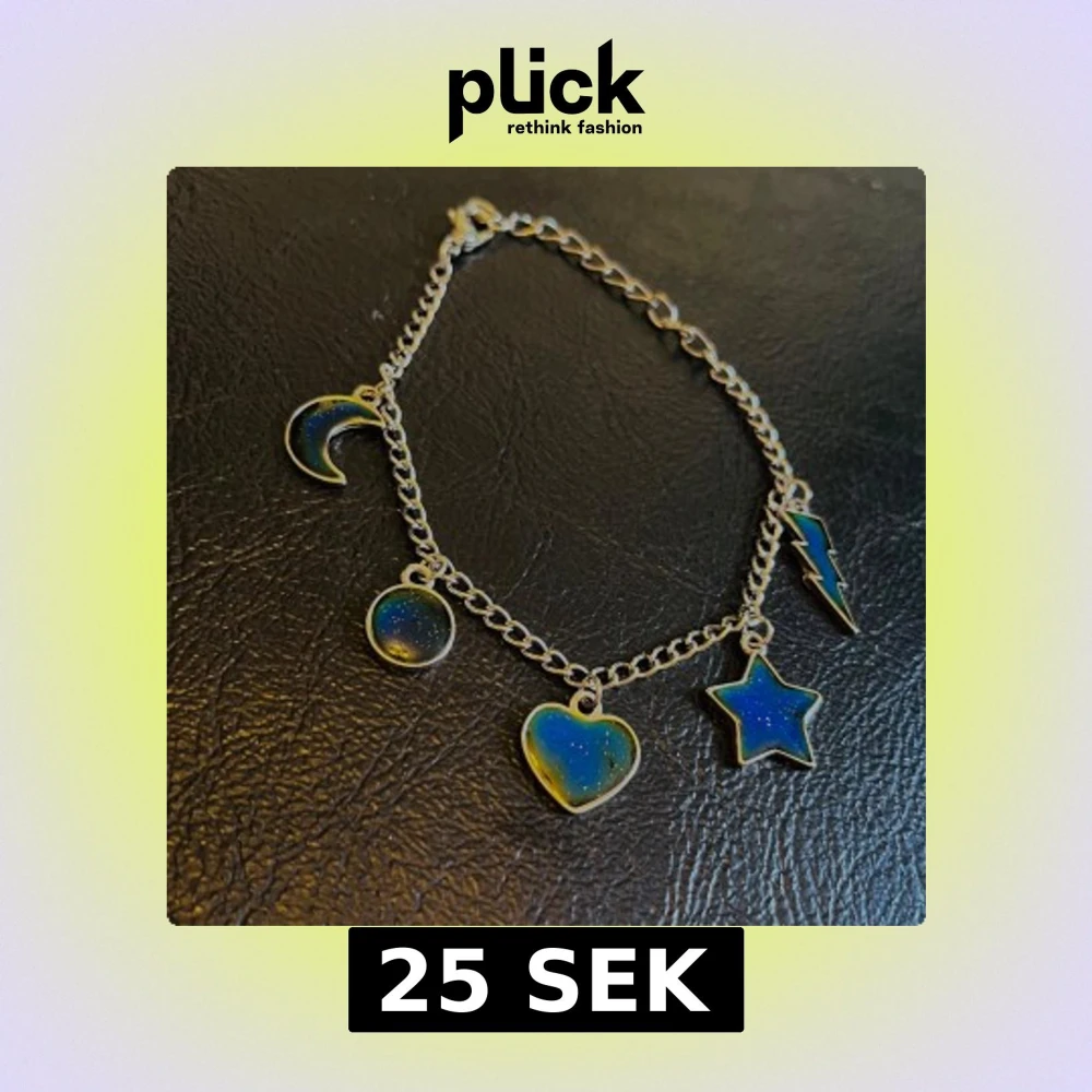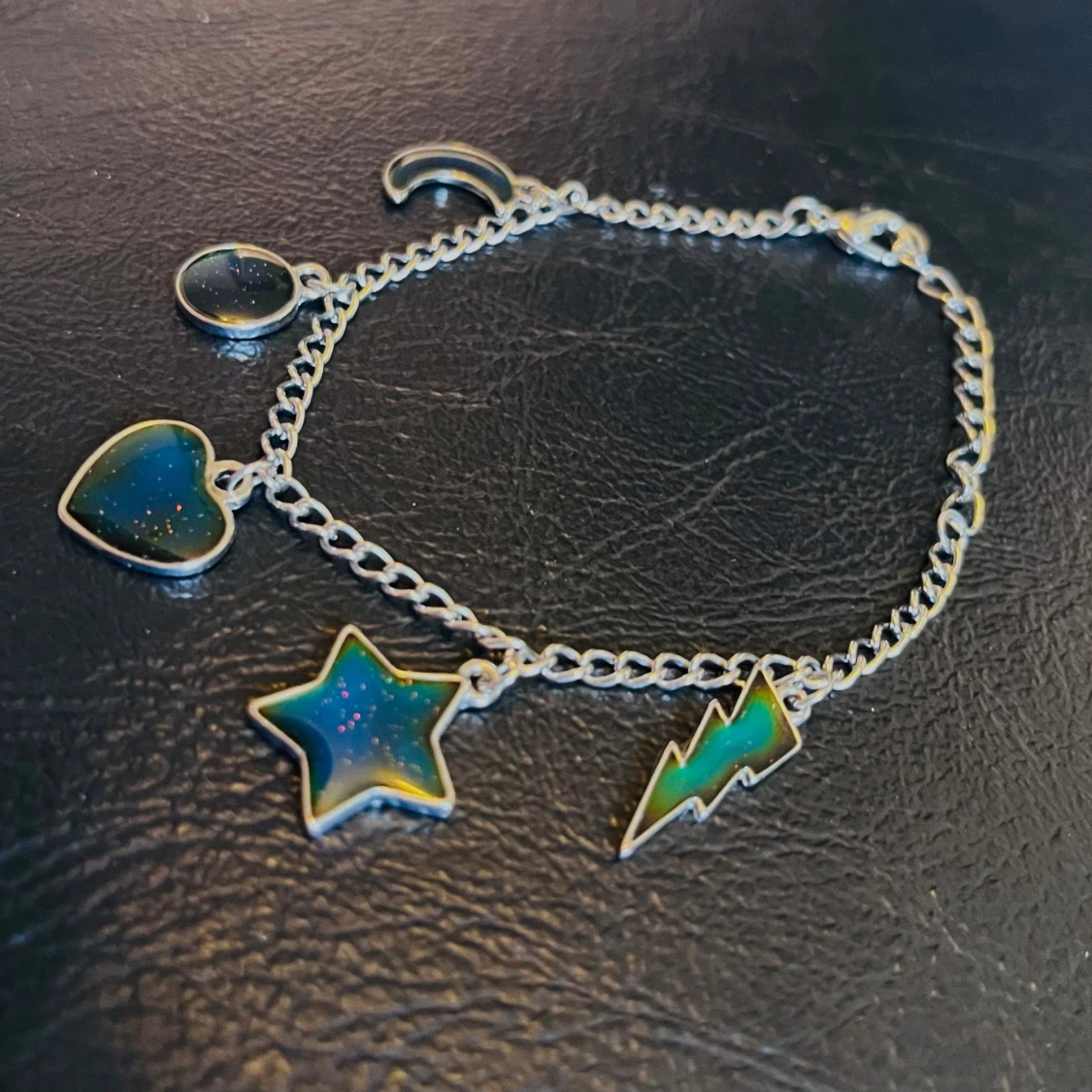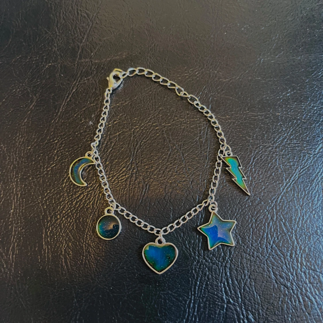 Coolt silverfärgat armband med fem berlocker: måne, rund, hjärta, stjärna och blixt. Alla berlocker har en blå och grön glittrig finish som ger en galaktisk vibe. Perfekt för dig som gillar unika detaljer och vill sticka ut med din stil.