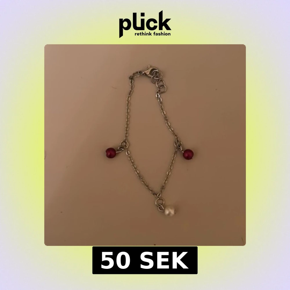 Elegant silverfärgat armband med tre pärlor, två i röd nyans och en i vit. Ej nickelfritt!