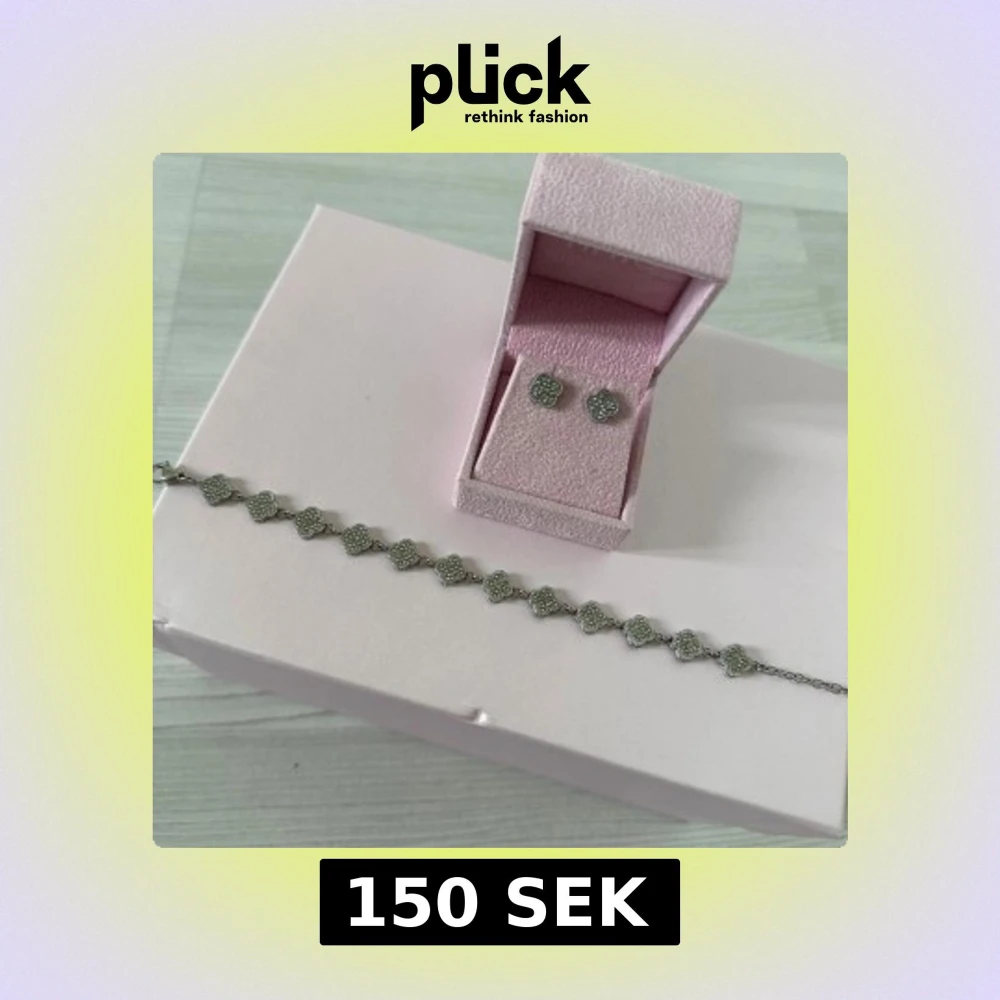 Snyggt set med armband och örhängen i silverfärg. Båda har små fyrklöverformade hängen täckta av glittrande stenar som ger en lyxig känsla. Perfekt för dig som gillar eleganta detaljer och vill sticka ut lite extra.