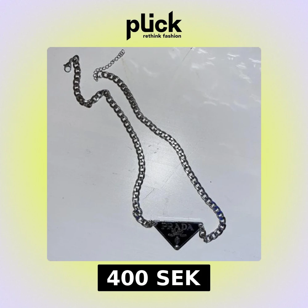 Stilrent silverfärgat halsband från Prada med en kedja och en triangulär platta med logotyp. Perfekt för att ge en lyxig touch till din outfit. Skön under sommaren säljs billigt för har inget kvitto men är helt äkta.