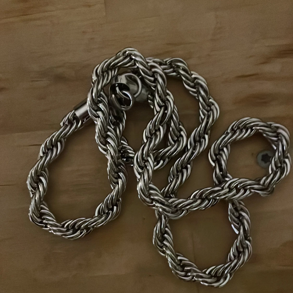 Säljer ett snyggt silverfärgat halsband med en cool tvinnad design. Perfekt för att ge din outfit lite extra stil. Halsbandet är i mycket bra skick och passar till både vardag och fest. Ett måste för alla som gillar att sticka ut!