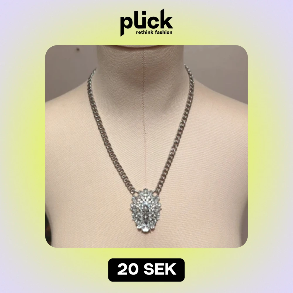 Säljer ett snyggt silverfärgat halsband med en stor glittrig detalj i mitten. Kedjan är robust och ger en cool look, perfekt för att piffa upp vilken outfit som helst. Detaljen i mitten är formad som en blomma med flera gnistrande stenar. Passar perfekt till fest eller en utekväll!