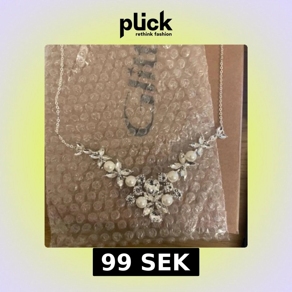 Ett elegant halsband i silverfärg med vita pärlor. Perfekt för att lyfta en outfit med sin glittriga och detaljrika design. Kedjan är tunn och smycket har en lyxig känsla.