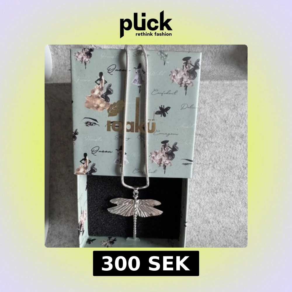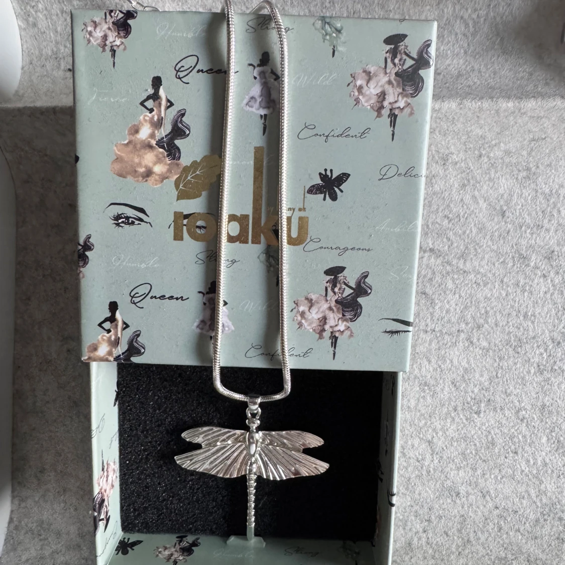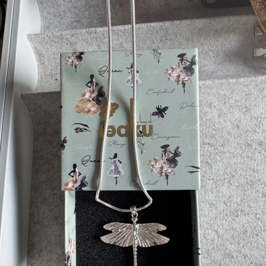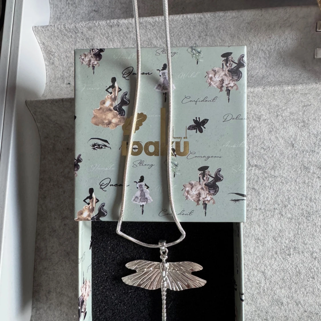 Unikt halsband från ioaku med en silverfärgad kedja och ett detaljerat trollslände-hänge.