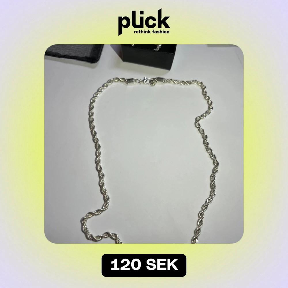 Säljer ett snyggt silverfärgat halsband med en tvinnad design. Perfekt för att ge en stilren touch till vilken outfit som helst. Halsbandet har en enkel låsning och passar både till vardags och fest. Ett måste för den som gillar stilrena smycken!