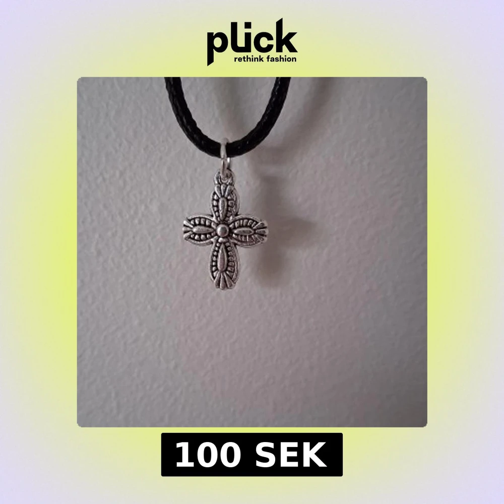 Snyggt halsband med ett detaljerat korshänge i silverfärg. Hänget har ett intrikat mönster och hänger på en svart flätad rem. Perfekt för att ge en stilfull touch till din outfit.