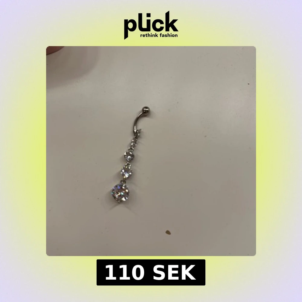 Elegant navelpiercing i silverfĂ€rg med flera glittriga stenar i olika storlekar. Aldrig anvĂ€nd! LĂ€ngd=10mm hĂ€nge=45mmâ ïž