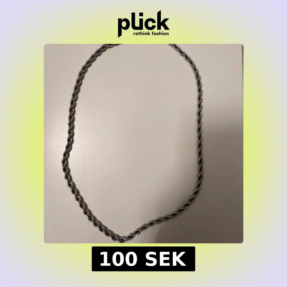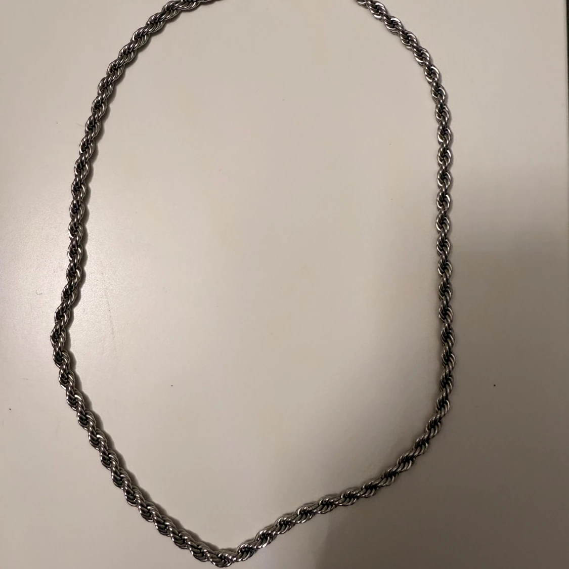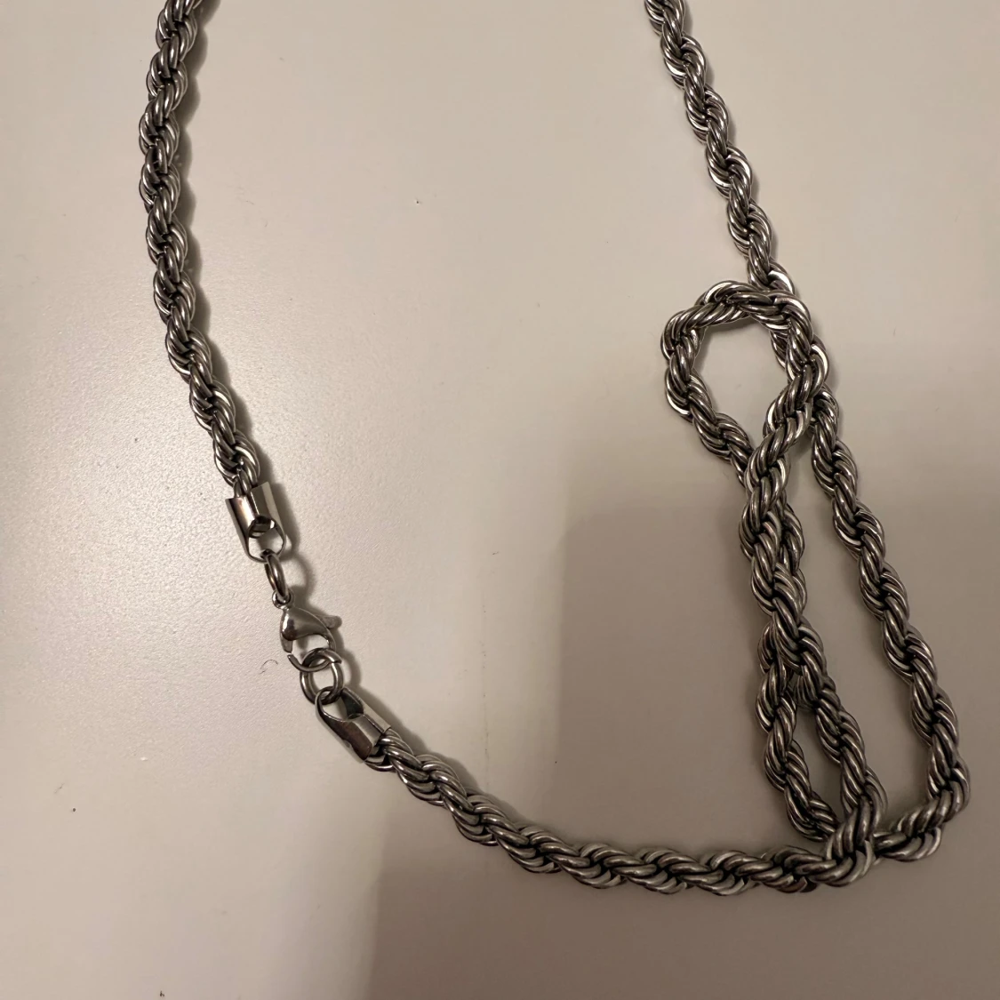 Säljer ett rostfrittstål stilrent halsband i silverfärg med tvinnad kedja. Kedjan har en snygg, robust look och stängs med ett klassiskt karbinlås. Perfekt för dig som gillar minimalistiska accessoarer med lite edge.