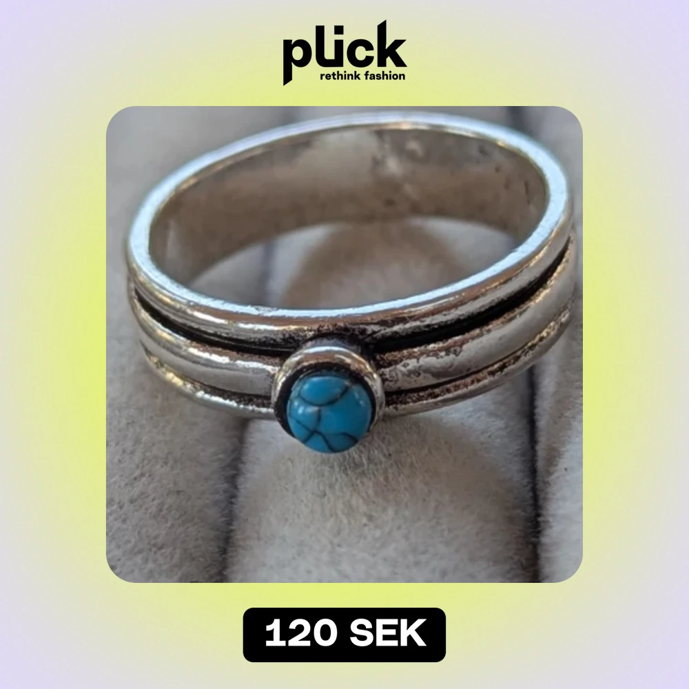 Säljer en snygg silverring med en liten turkos sten i mitten. Ringen har en enkel men stilren design med dubbla linjer som ramar in stenen.koppar material storlek 11 ( 20.7 diameteren)