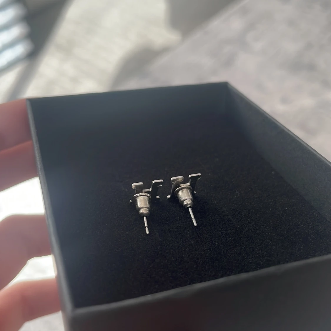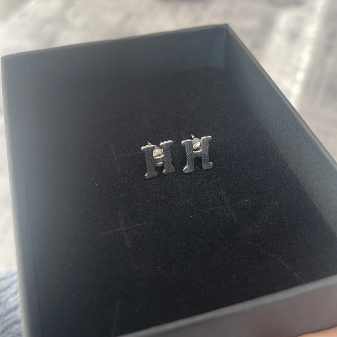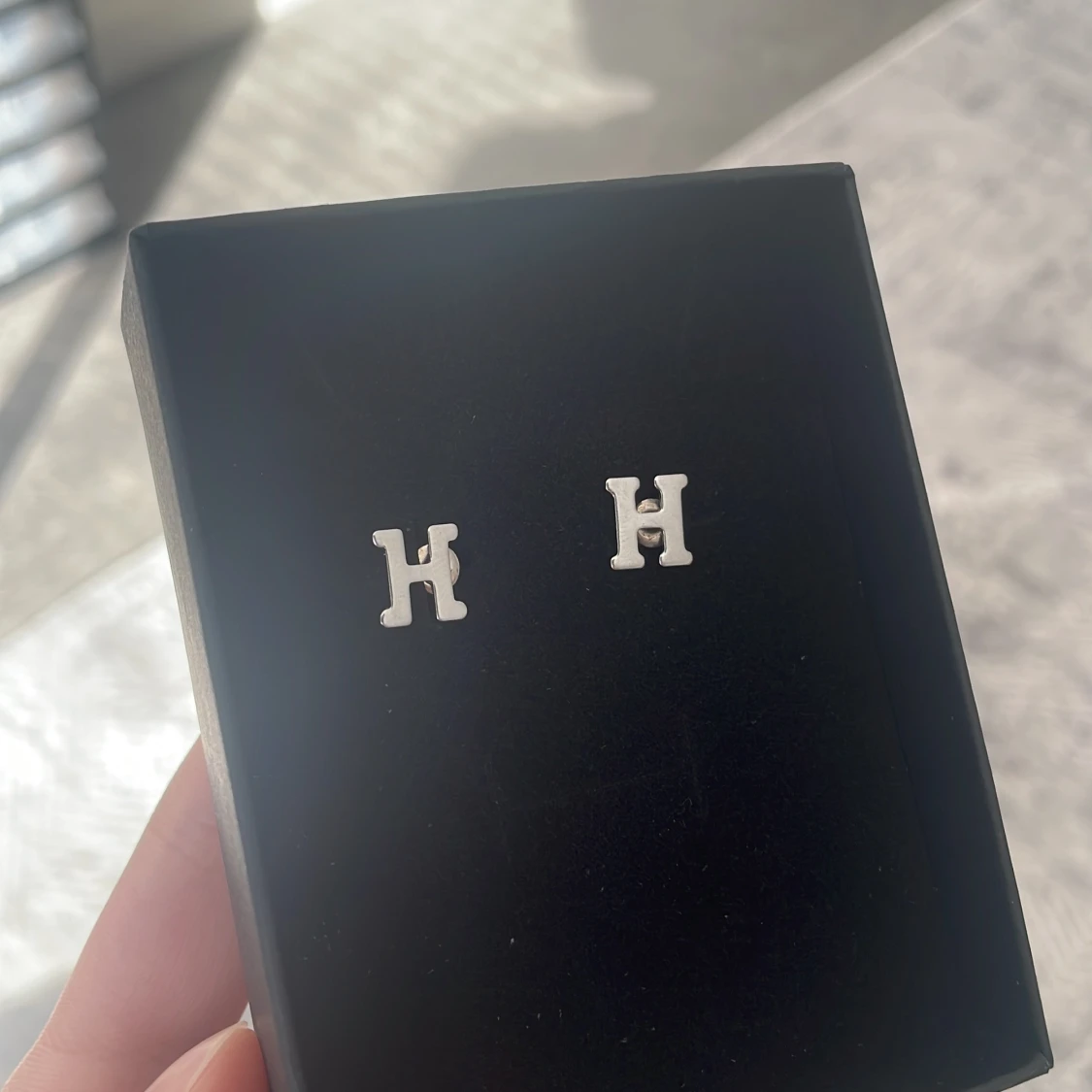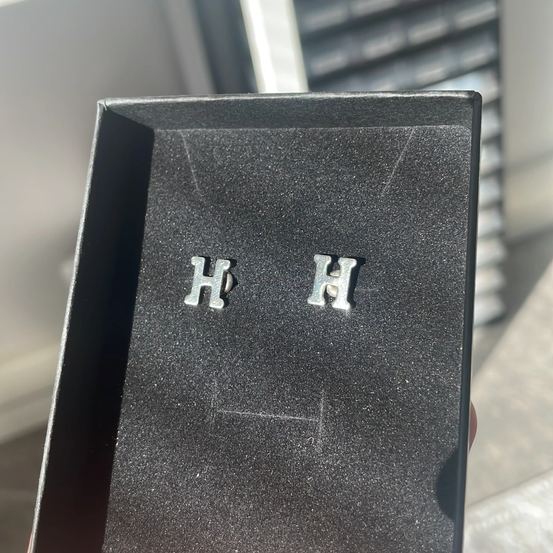 Säljer ett par stilrena örhängen i form av bokstaven H. De är i rostfritt stål och har en enkel, klassisk design. Kommer med smidig stiftbaksida.