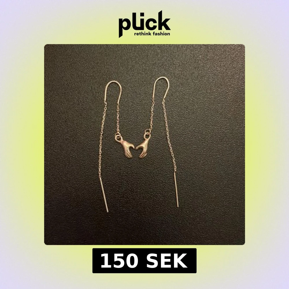 Unika och tunna silvriga örhängen med kedja och små hängande händer som detalj.