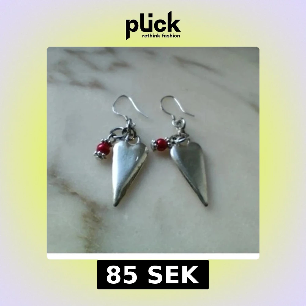 Krokarna är stämplade 925. Hängena är silverfärgade (2,4 cm långa) och jag tror att de är silverpläterade (det finns ett par mindre märken/ojämnheter i dessa). Vet inte om övriga ringar är i äkta silver eller ej. Med fin röd pärla ❤️ Frakt: 22 kr.