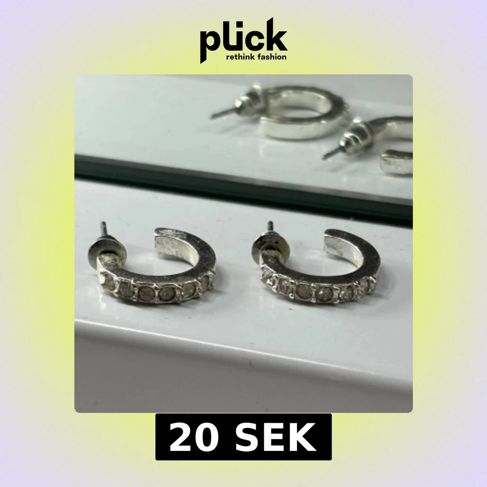 Säljer ett par silvriga halvrunda örhängen med infattade klara stenar längs framsidan. De har en klassisk och stilren design som passar perfekt för dig som gillar lite extra bling i vardagen. Snygga att matcha med andra silversmycken.