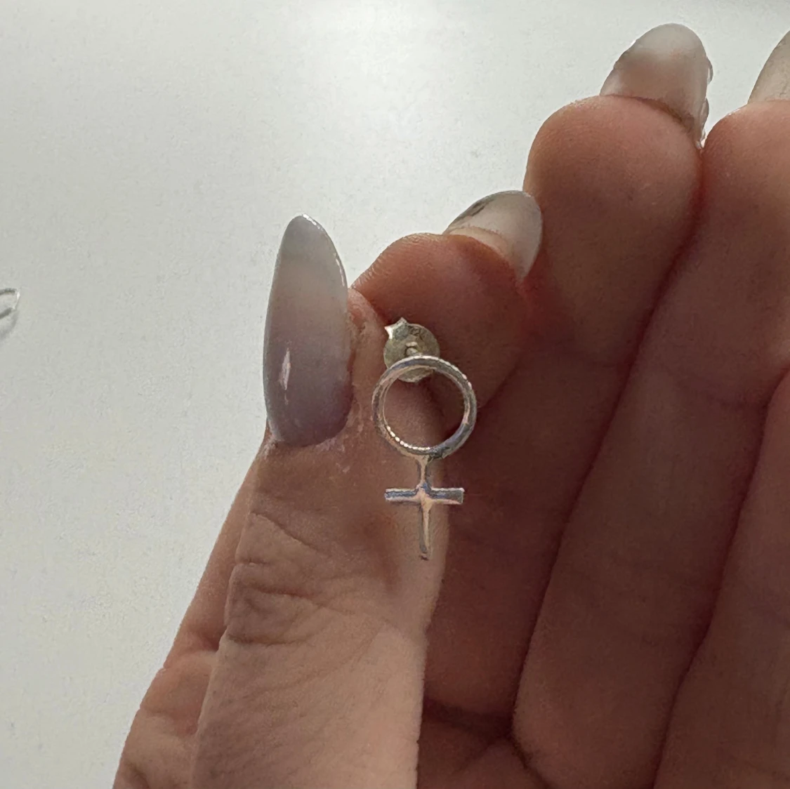 Säljer ett par stilrena örhängen i silverfärg formade som venus-symbolen. De är små och minimalistiska, perfekta för dig som vill ha ett statement men ändå hålla det enkelt. Stiftmodell som sitter bekvämt i örat.