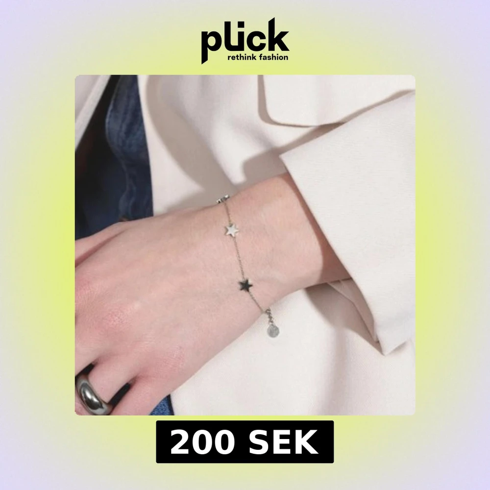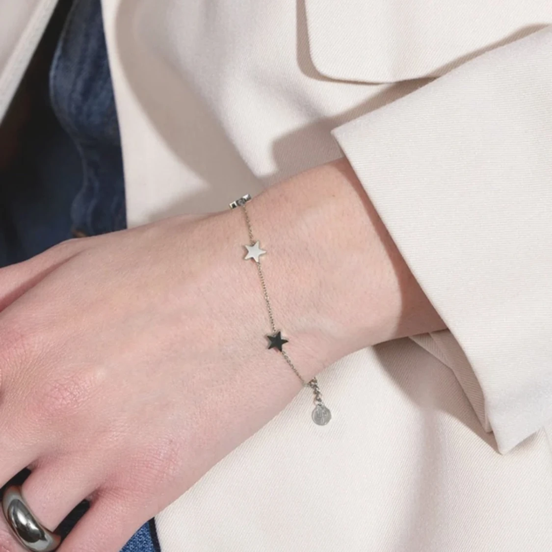 Ett tunt och stilrent armband i silverfärg med små stjärnor, en ljus och en mörk. Kedjan är tunn och har en liten rund detalj vid låset. Perfekt för dig som gillar minimalistiska smycken med en twist.