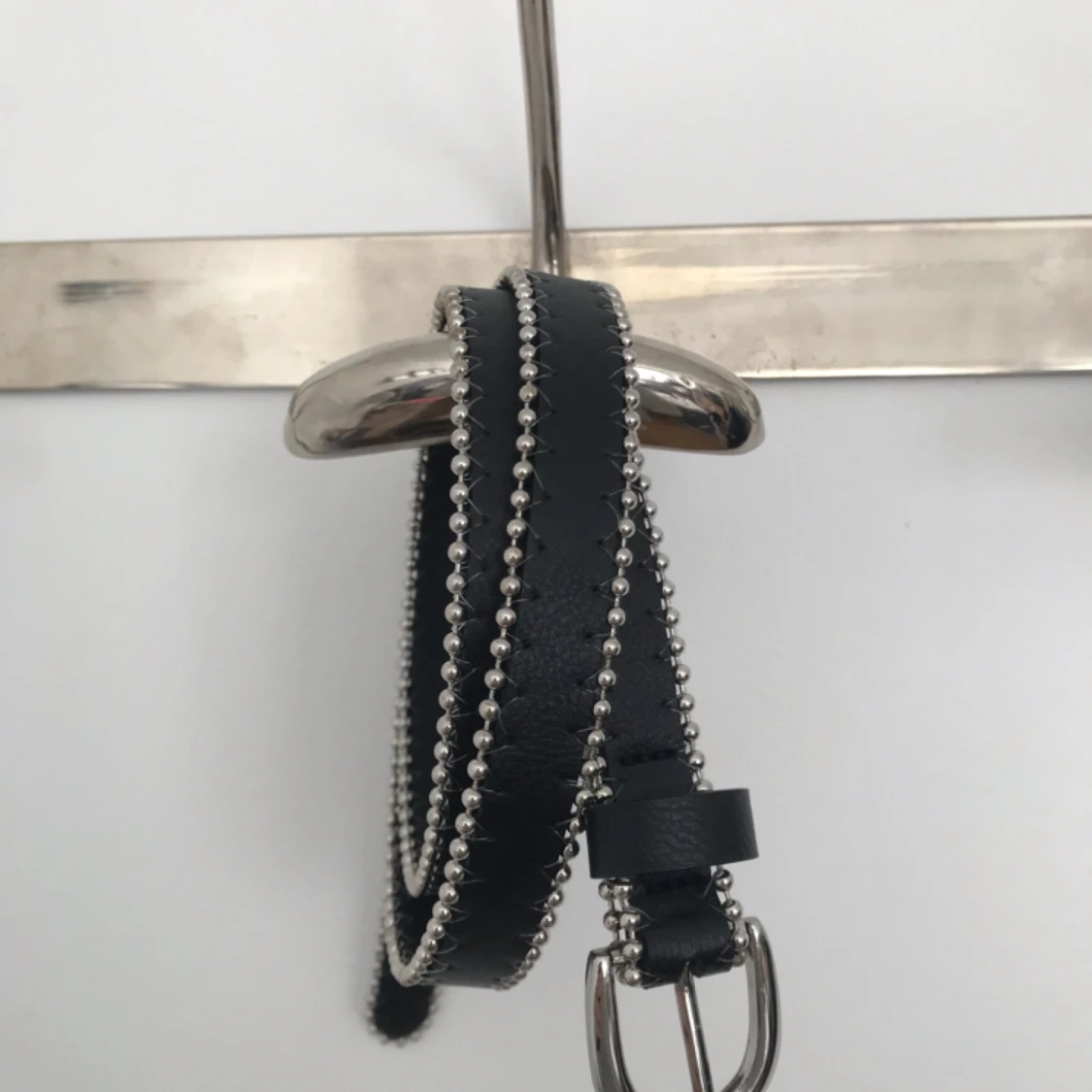 Svart skärp med silvriga pärlor, köpt på stradivarius i London. Aldrig användt, fint skick!