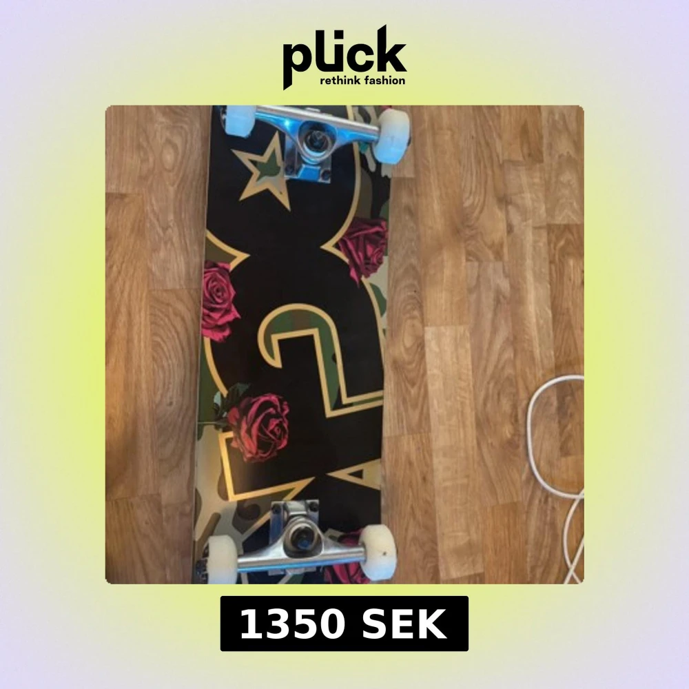 Säljer en skateboard med svart griptape på ovansidan och en snygg undersida med DC-logga, kamouflagemönster och röda rosor. Brädan har vita hjul och silverfärgade trucks. Perfekt för dig som gillar streetstyle och unika designer.