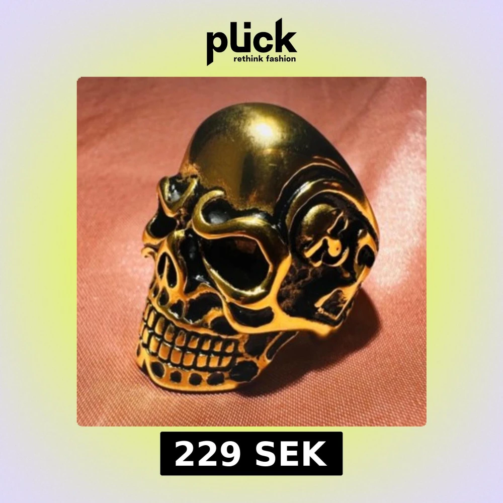 Tung och uttrycksfull dödskallering i guldpläterat rostfritt stål. Detaljerat snidad med blank finish – perfekt för alternativ, biker eller gothstil. Höjd ca 3,3 cm, storlek ca 20,6 mm (US 10). Ny och oanvänd. En accessoar som syns! Ingen prutning – bundlerabatt vid flera köp. Jag rensar smyckesskrin och garderob, kolla gärna mina andra annonser också!
