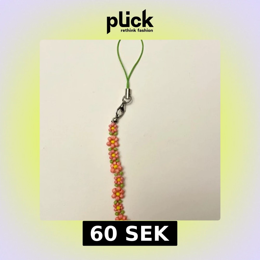 Sött mobilband med små pärlor i form av rosa och orange blommor med gröna detaljer. Bandet har en grön snodd och metallfäste för enkel fastsättning på mobilen eller väskan. Handgjord. Ca 12 cm totalt. Delen med blommorna ca 7 cm.