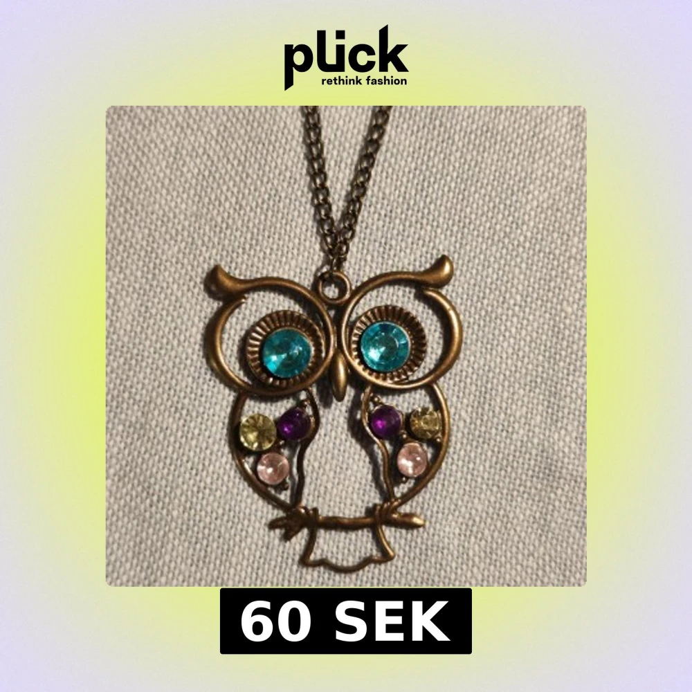 Charmigt halsband med en uggla i antik bronsfärg. Ugglan är dekorerad med glittriga stenar i blått, lila, rosa och gult. Kedjan är tunn och matchar ugglans färg. Perfekt för att ge en unik touch till din stil.