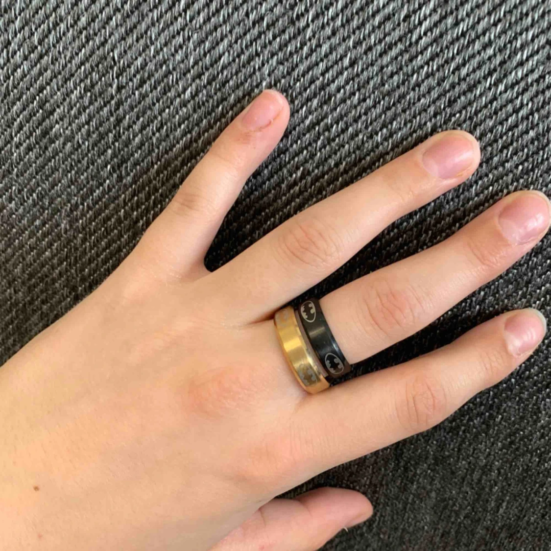 Batmanring. En guldig och en svart ring med Batmans märke på. Guldig ring ör i M och svart i S. Säljer en för 65kr och båda för 110kr. FINNS I SILVER OCKSÅ!