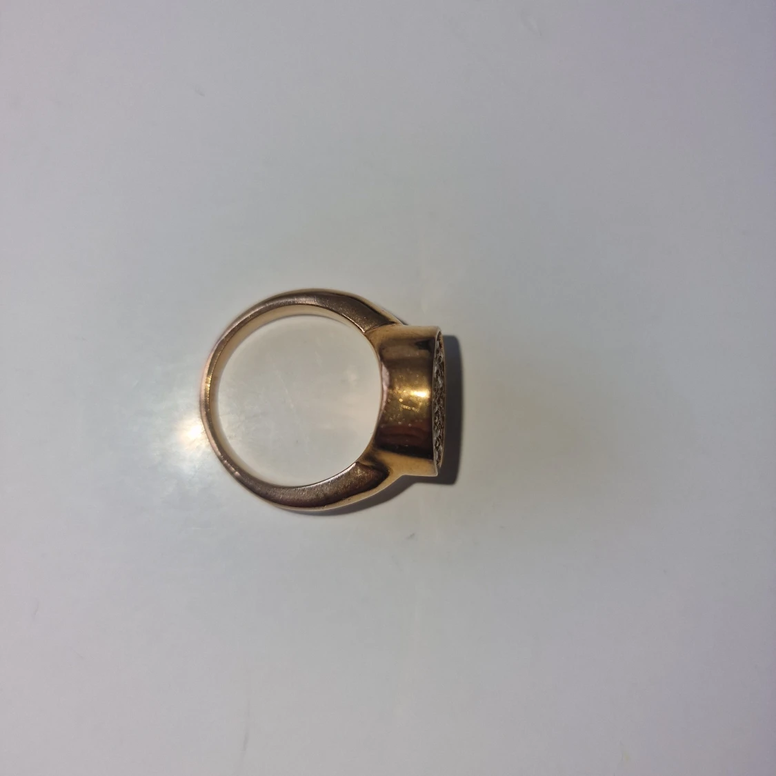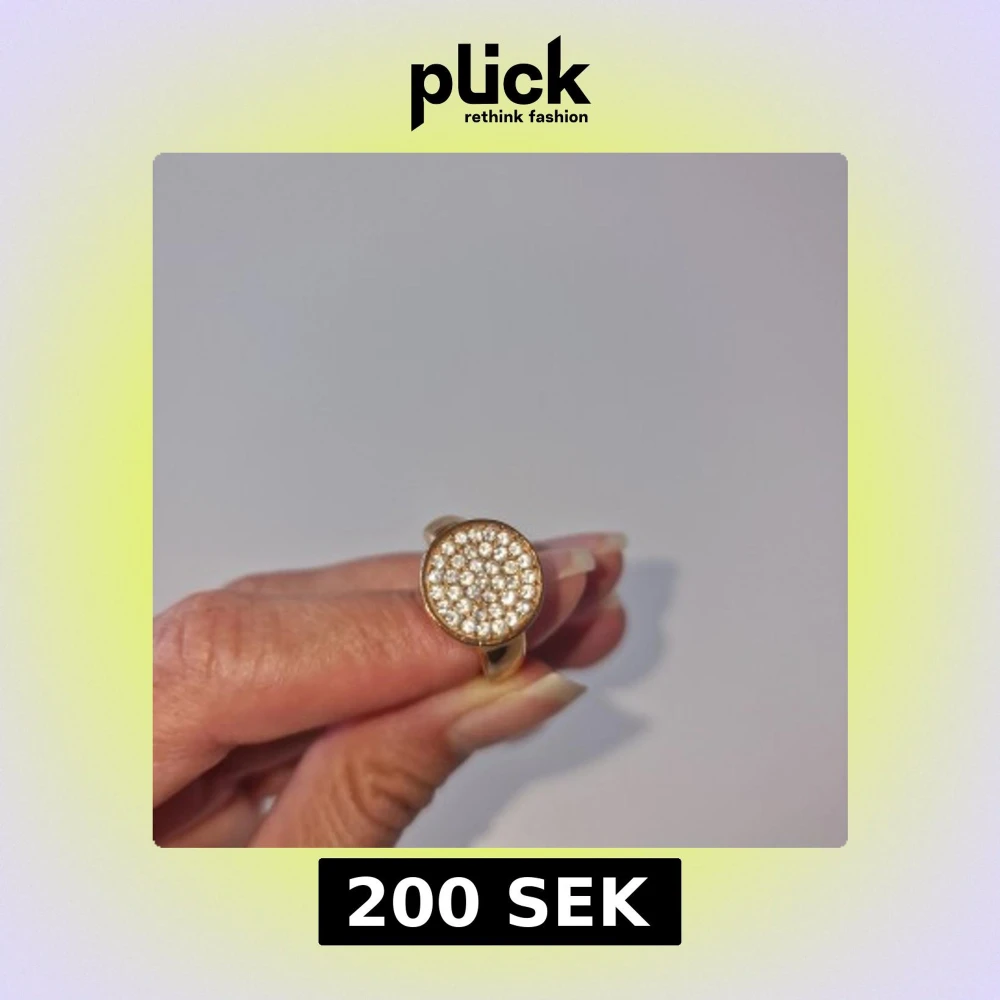 Snygg guldfärgad ring med rund topp täckt av små glittrande stenar. Ringen har en chunky känsla och ger ett lyxigt intryck.