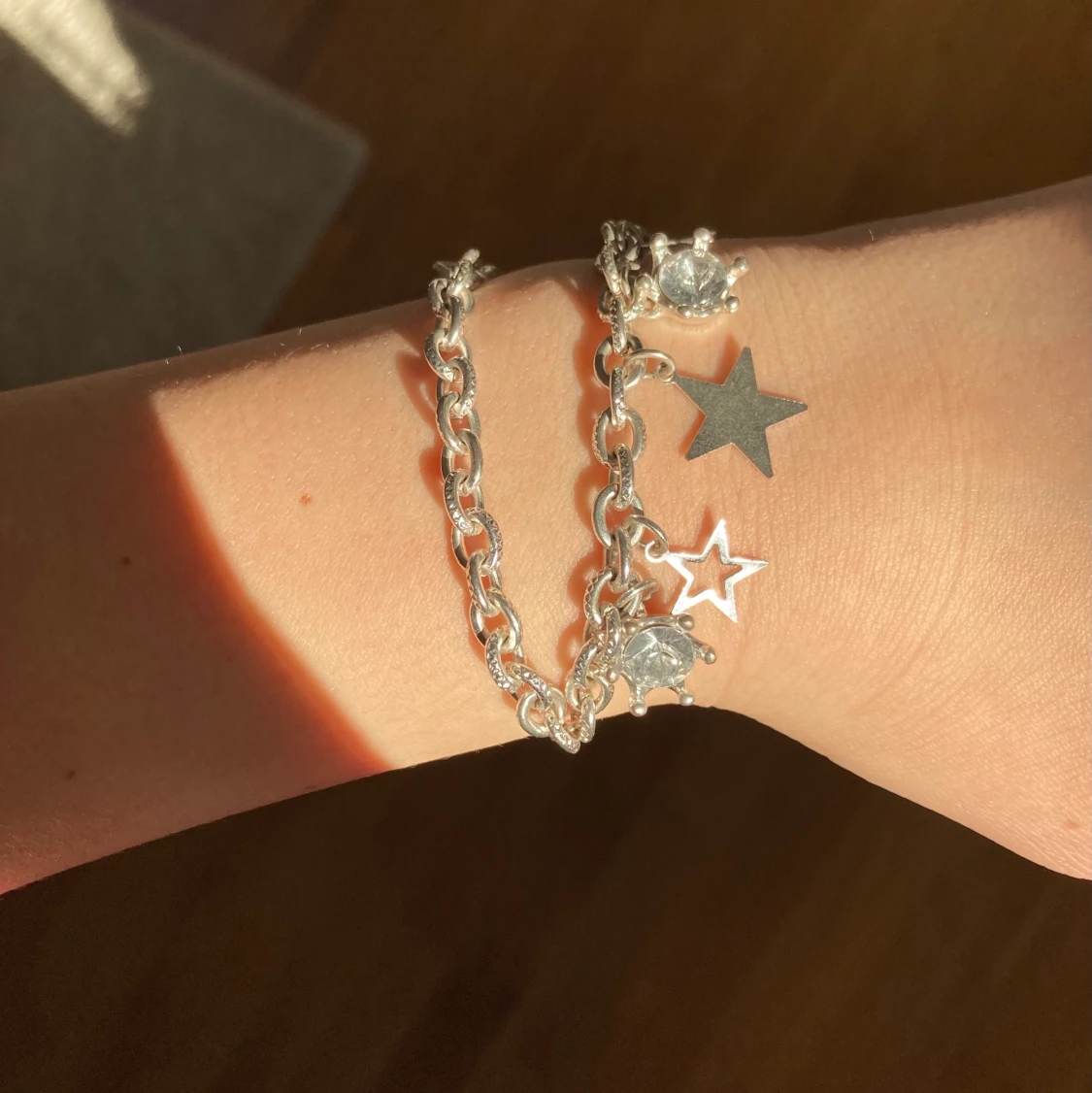 Fint silvrigt armband med berlocker. Nyskick då jag fick det i julklapp men använder aldrig armband så bättre att någon annan gör det! 😊 känns ganska tungt och inte billigt eller plastigt.