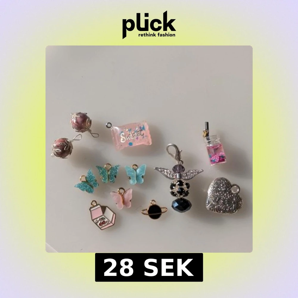 Säljer ett set med olika berlocker och hängen. Inkluderar fjärilar i blått och rosa, en hjärtformad berlock i silver, en svart planetberlock, och en rosa flaska med pärlor. Perfekt för att skapa egna smycken eller som dekorationer. Vissa är handgjorda säljer allt på bilden för 28 kr. Man kan köpa styckvis meddela i sådana fall. Vissa har rostat lite grann men det märks inte så tydligt enligt mig.